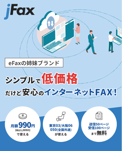 jFaxでは、月額990円(税込1,089円)の料金で、受信100ページと送信50ページが含まれています。ただし、これらの枚数を超えた場合は、1枚ごとに10円の追加料金が発生します。